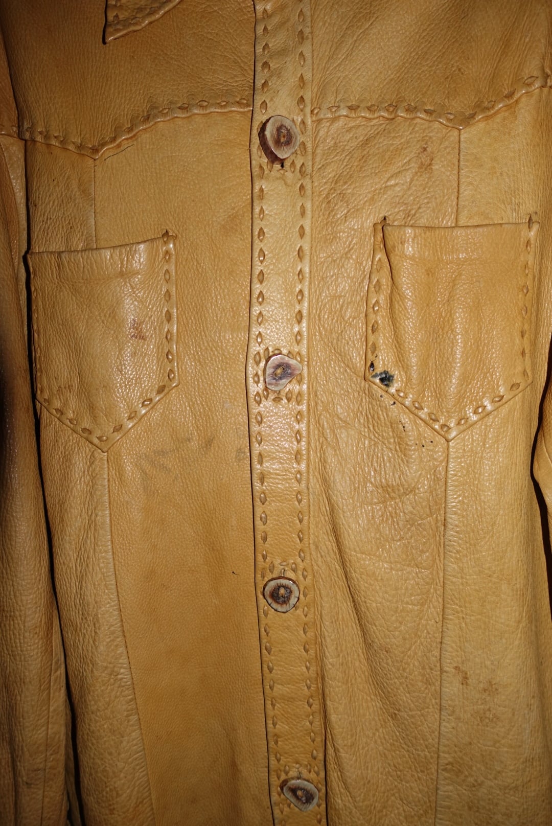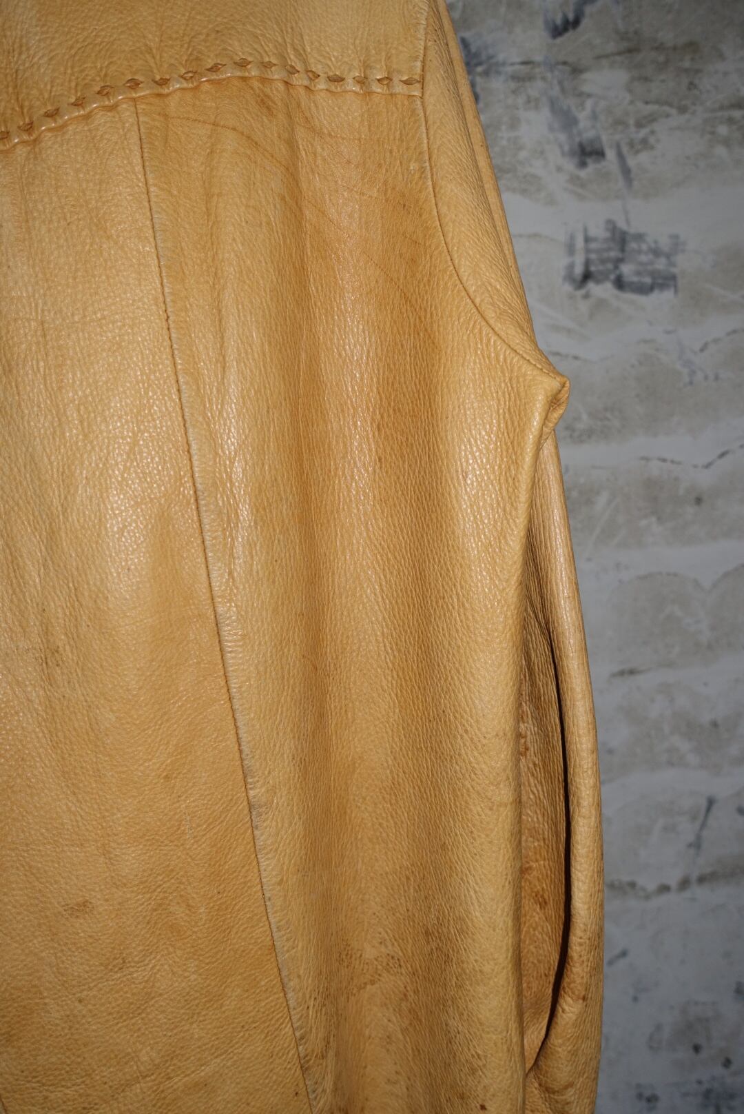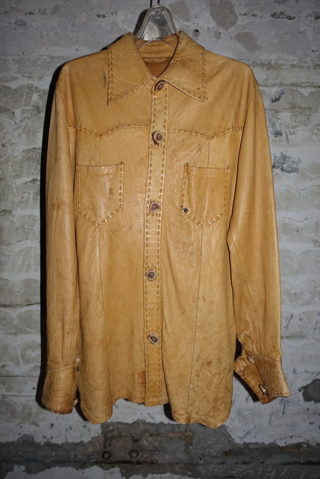 すごく70年代にある洋服の雰囲気なんで、恐らくそのあたりの年代だとおもいます。時代をレペゼンする服はやはり男前です。たまには素直に書きましょうか。古い服なので汚れやシワ、痛みあります。皮自体はまだ張りもありモチっとした感触。着るとそこまで重さも感じませんが人によりけりです。ボタンがいい雰囲気と大きさですがホールが小さいんで止めるのに苦労します。ステッチとボタン糸もレザーなので97%ぐらいは革でできてます。たぶん牛です。こちらからは以上です。