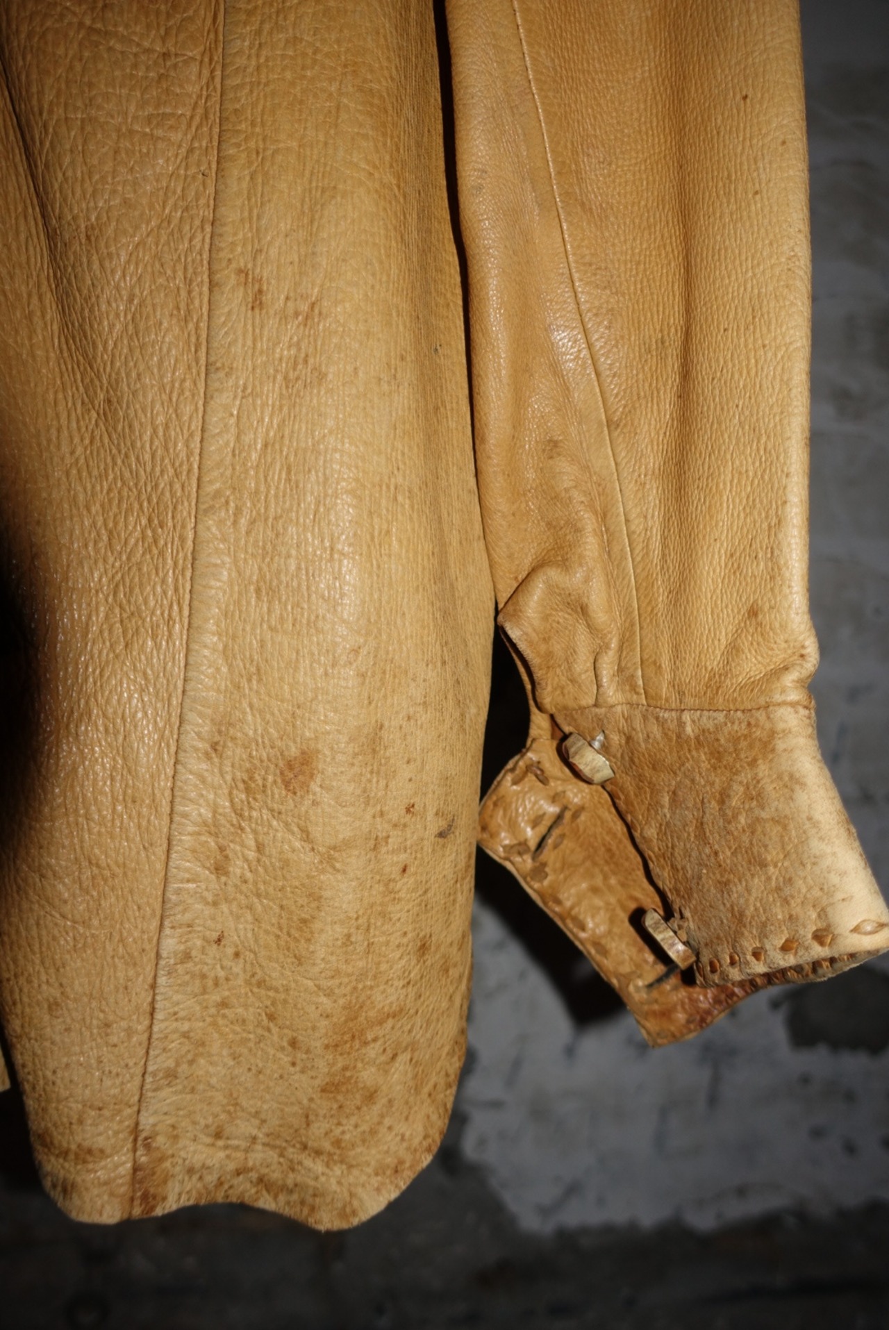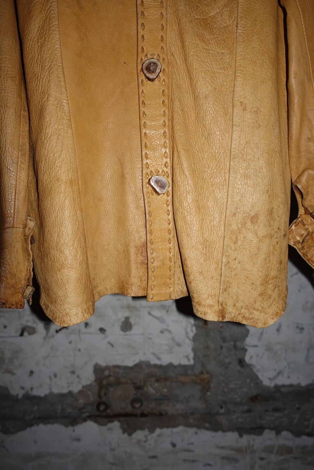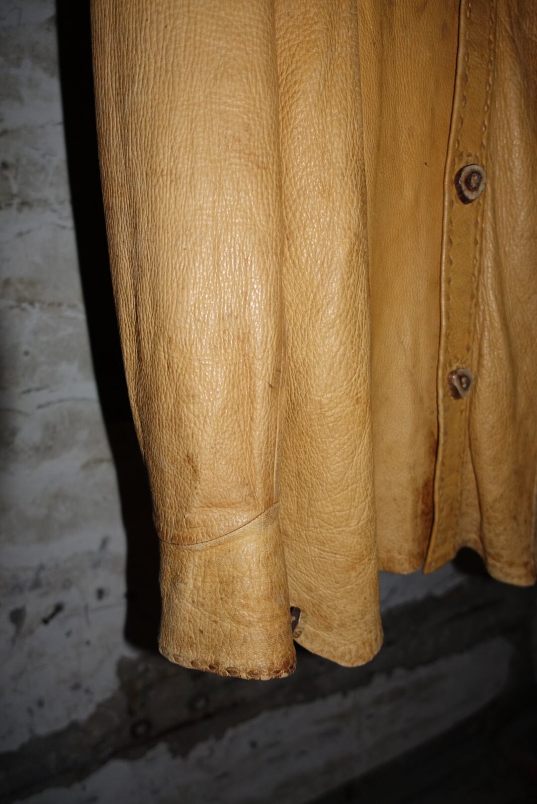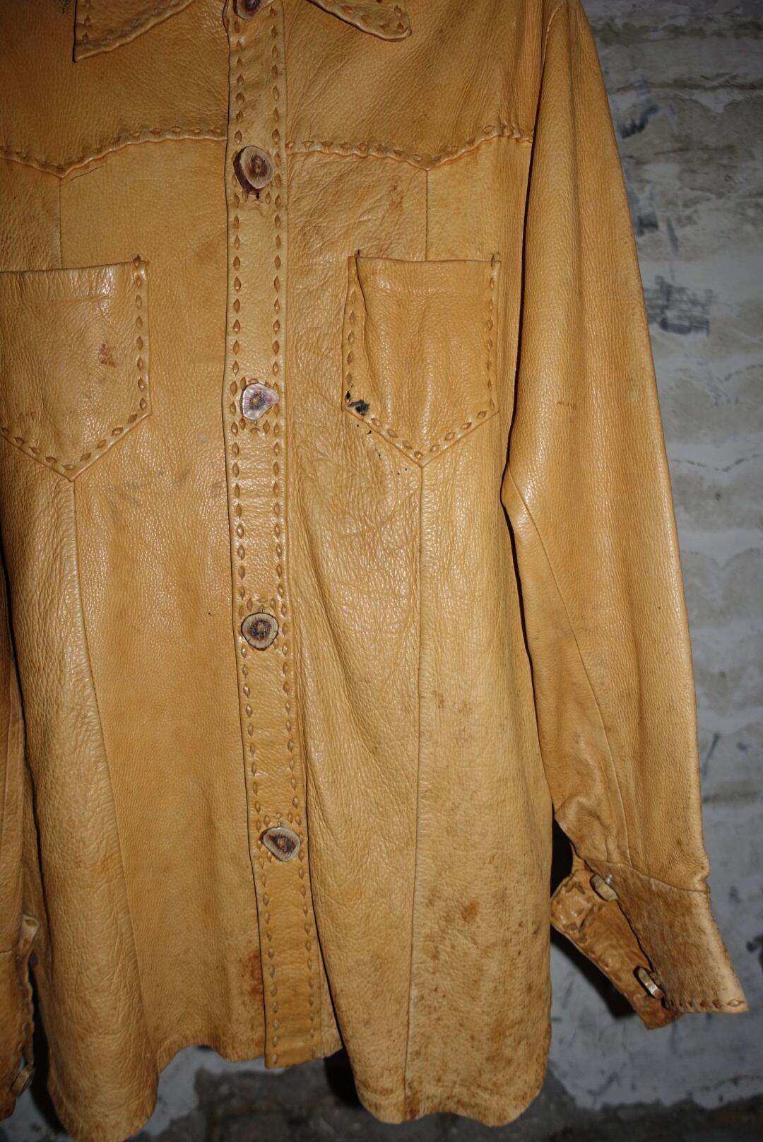 すごく70年代にある洋服の雰囲気なんで、恐らくそのあたりの年代だとおもいます。時代をレペゼンする服はやはり男前です。たまには素直に書きましょうか。古い服なので汚れやシワ、痛みあります。皮自体はまだ張りもありモチっとした感触。着るとそこまで重さも感じませんが人によりけりです。ボタンがいい雰囲気と大きさですがホールが小さいんで止めるのに苦労します。ステッチとボタン糸もレザーなので97%ぐらいは革でできてます。たぶん牛です。こちらからは以上です。