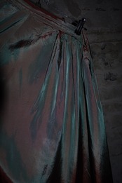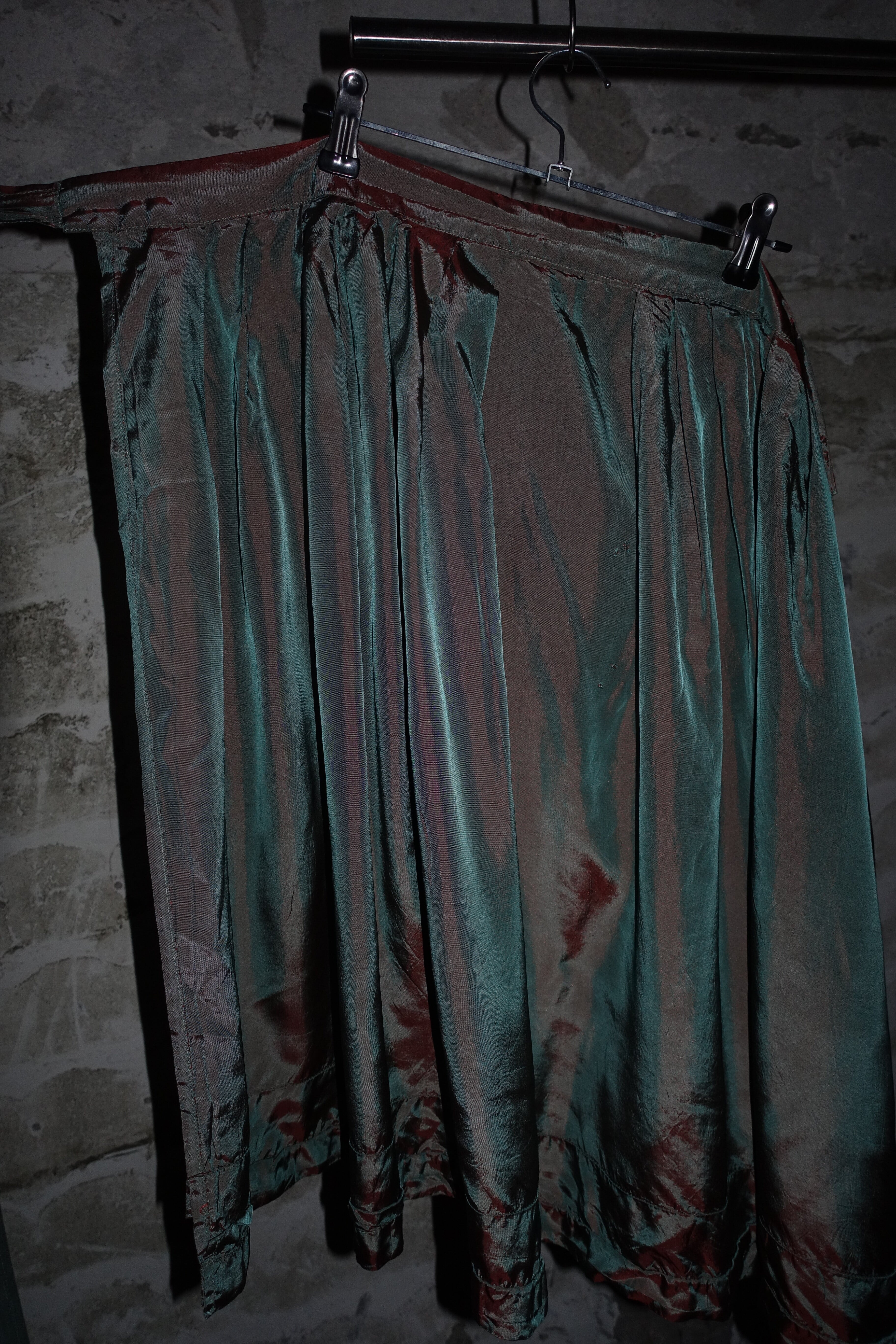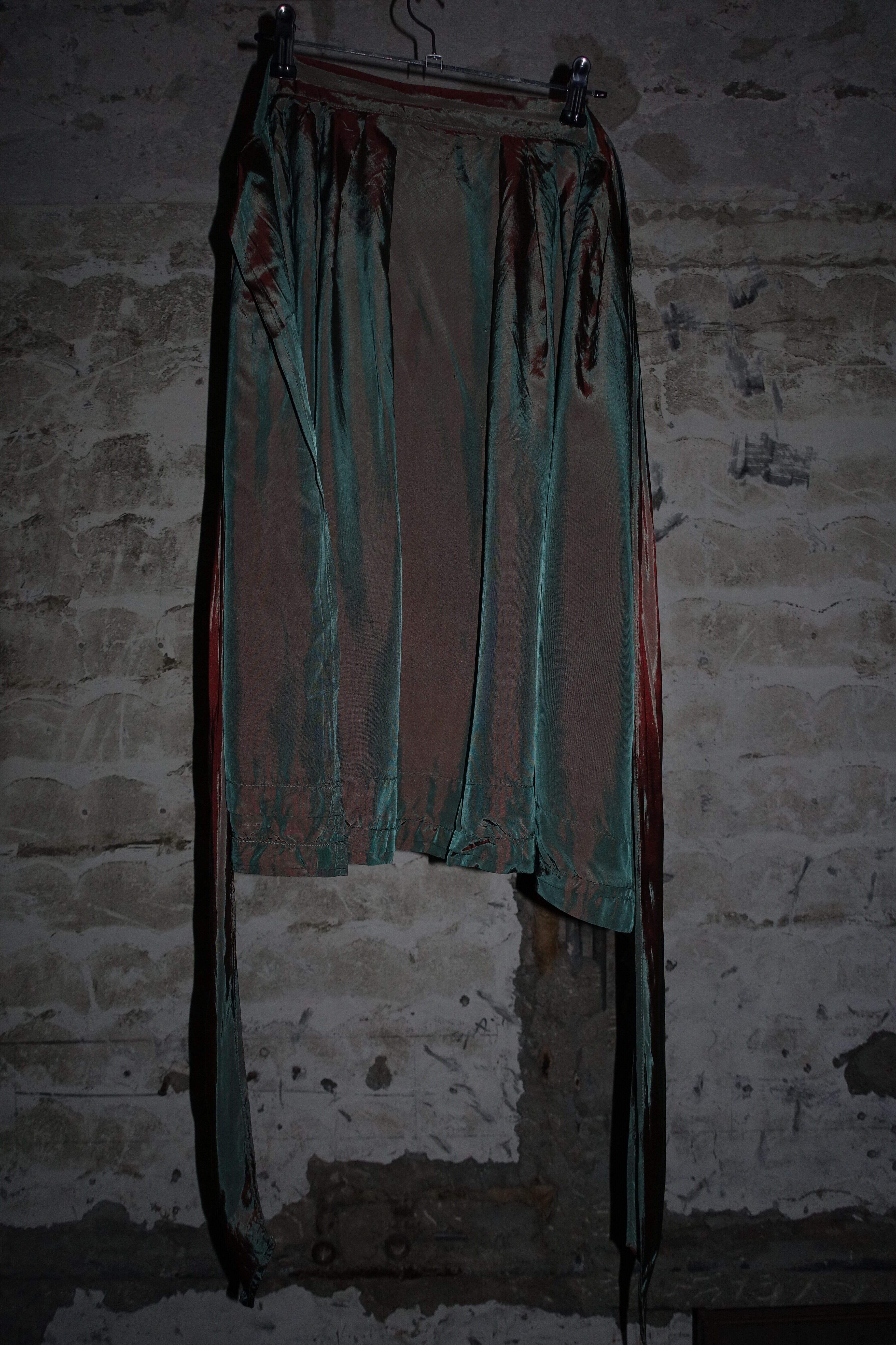 エプロン(服を汚れから守る洋風の前掛け)です。ビンテージのデニムやカレッジっぽいのしてる人たまーに見ます。こちらは玉虫織の1枚、詳細はG先生に聞いてください。バーバリーのコートでもあるんでしたっけ、知らんけど。5人見れば5人とも違うふうに言いそうな、そんな表現しにくい色味ですがすごい光沢で光る服なんて素敵な言葉を当てたくなります。言わずもがなですが腰はもちろん頭、胸、首などどこにでも巻ける自由があります、見本は見せないでおきます。イレギュラーな場所に巻いていようが料理する場面になれば即エプロンとして使ってもらって結構です。活躍すること間違いなし
